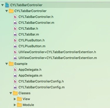 ├── CYLTabBarController #核心库文件夹,如果不使用 CocoaPods 集成,请直接将这个文件夹拖拽带你的项目中