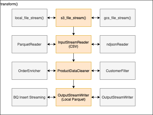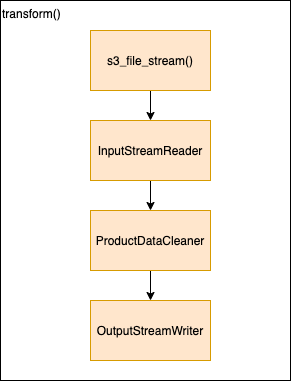 - transform() - orchestration function, iterates over batches and processes each 1 by 1