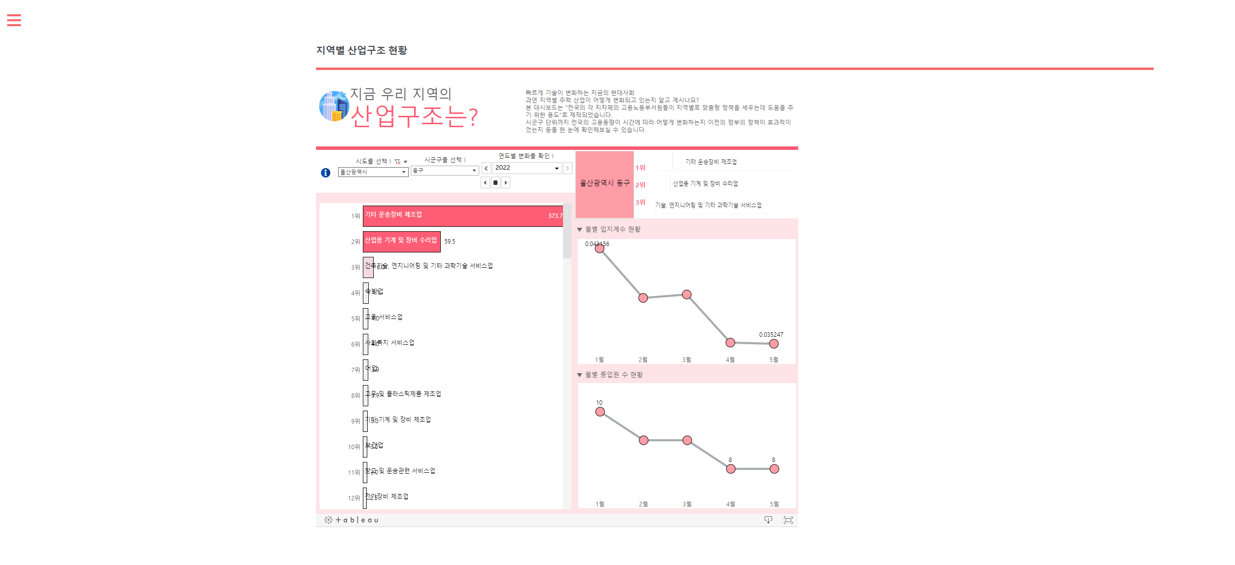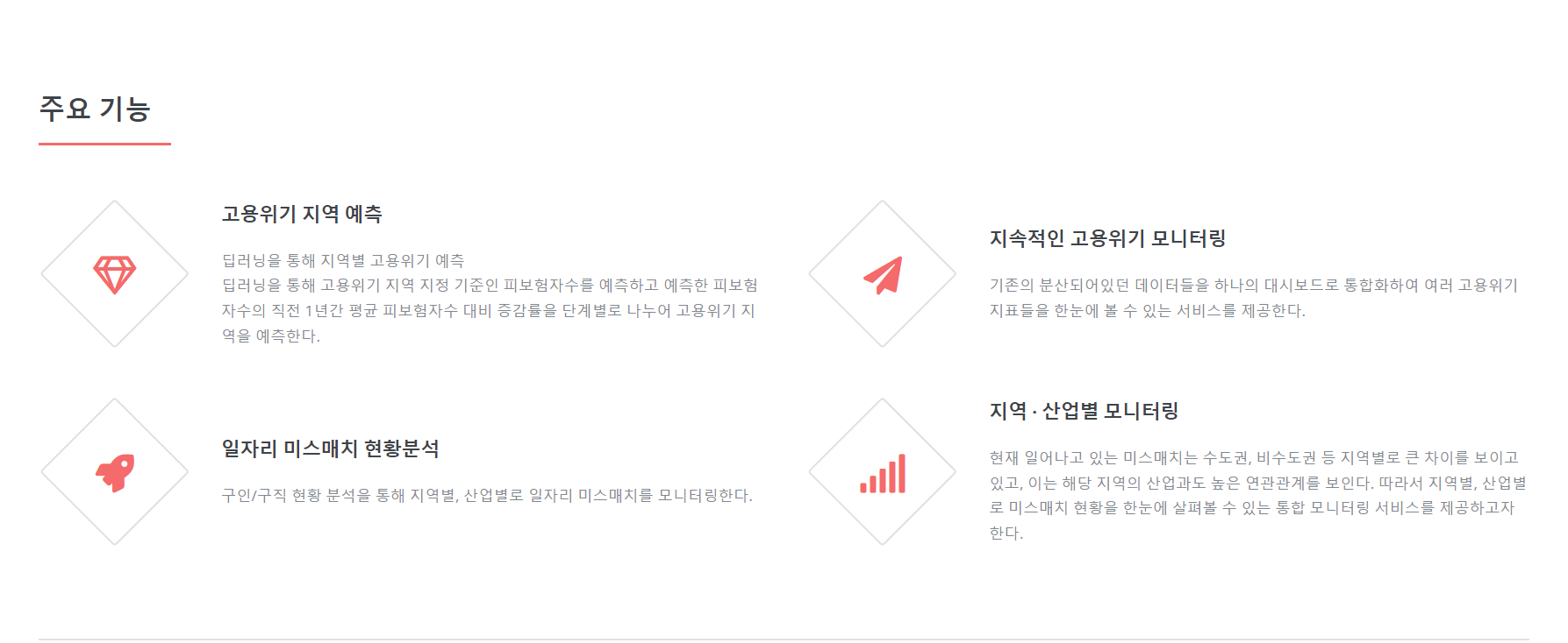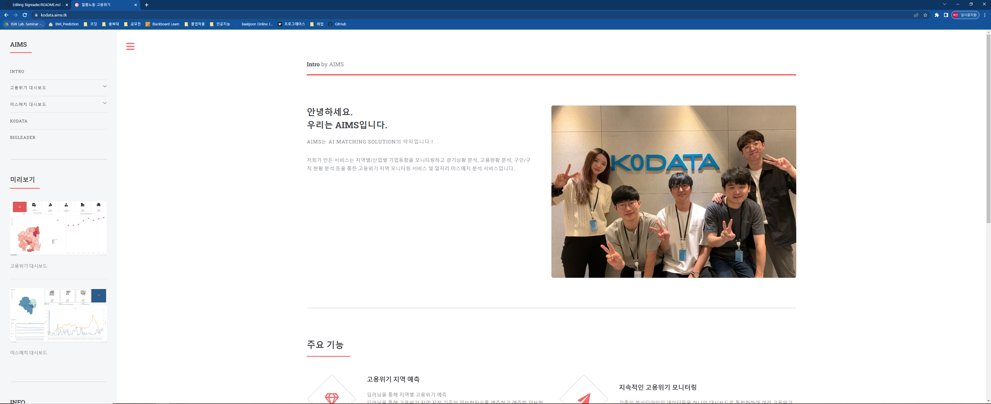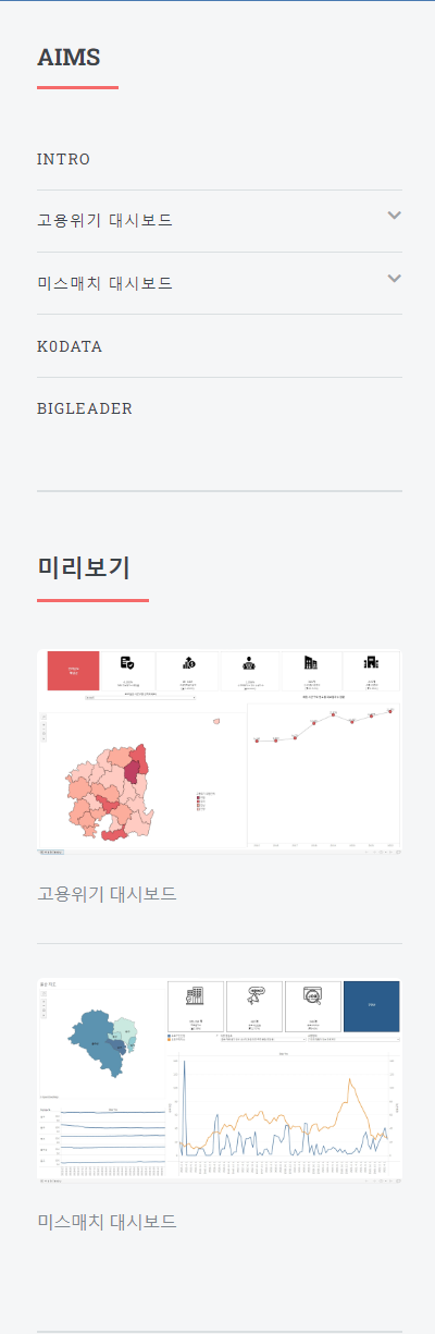 Bigreader 일자리 미스매칭 프로젝트 URL: https://aims.dingguri.com/ 개발목표 여러 통계자료와 KODATA에서 제공한 데이터를 사용하여 딥러닝 기술을 접목시켜 고용위기 지역을 예측하고 빅데이터를 기반으로 일자리 미스매칭 현황을 시각화하여 일자리 정책 관계자들이 선제적으로 대응할 수 있도록 돕고자 함. 개발기간 2022년 7월 18일 ~ 2022년 8월 31일 개발툴 메인화면 주요 메인기능 설명 메뉴바 지역별 고용위기 예측 지역별 산업구조 현황 지역별 인구구조 추이 구인 구직난 지역별 기업현황 인구별 변화 추이