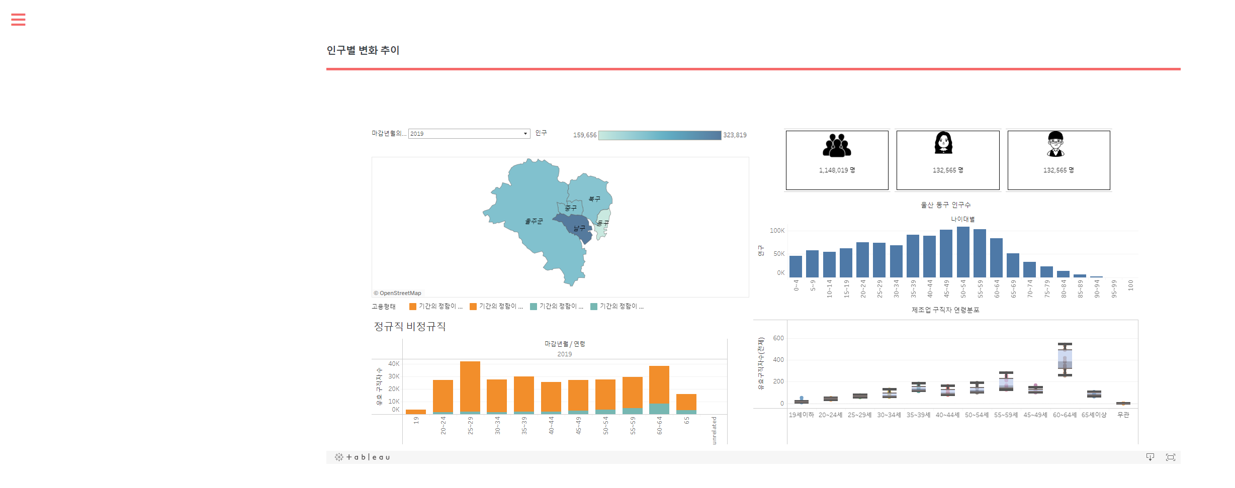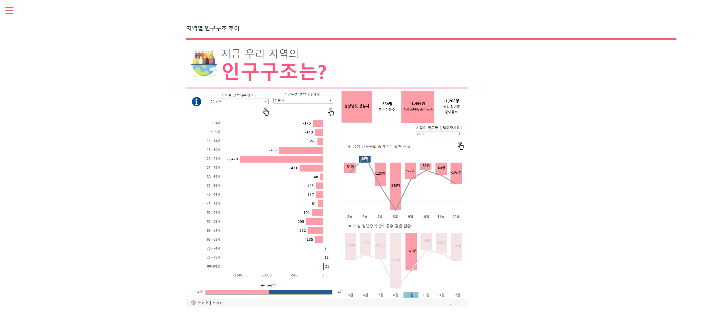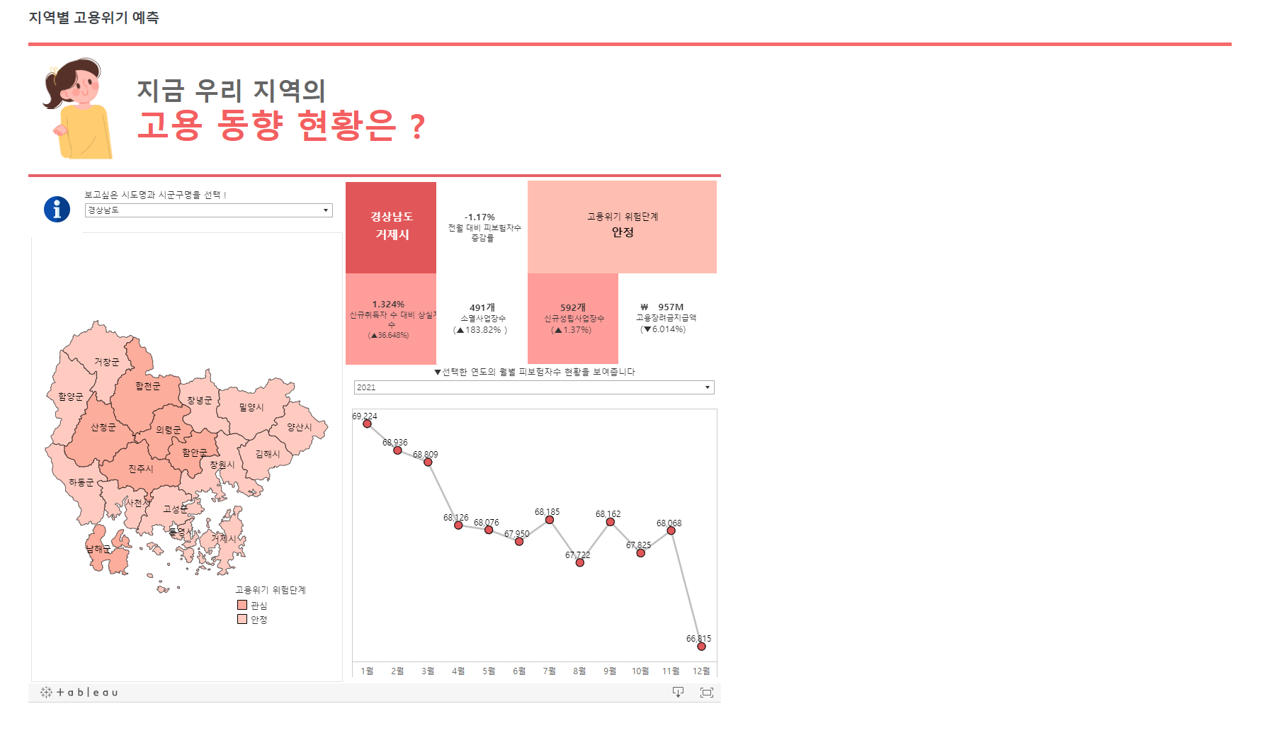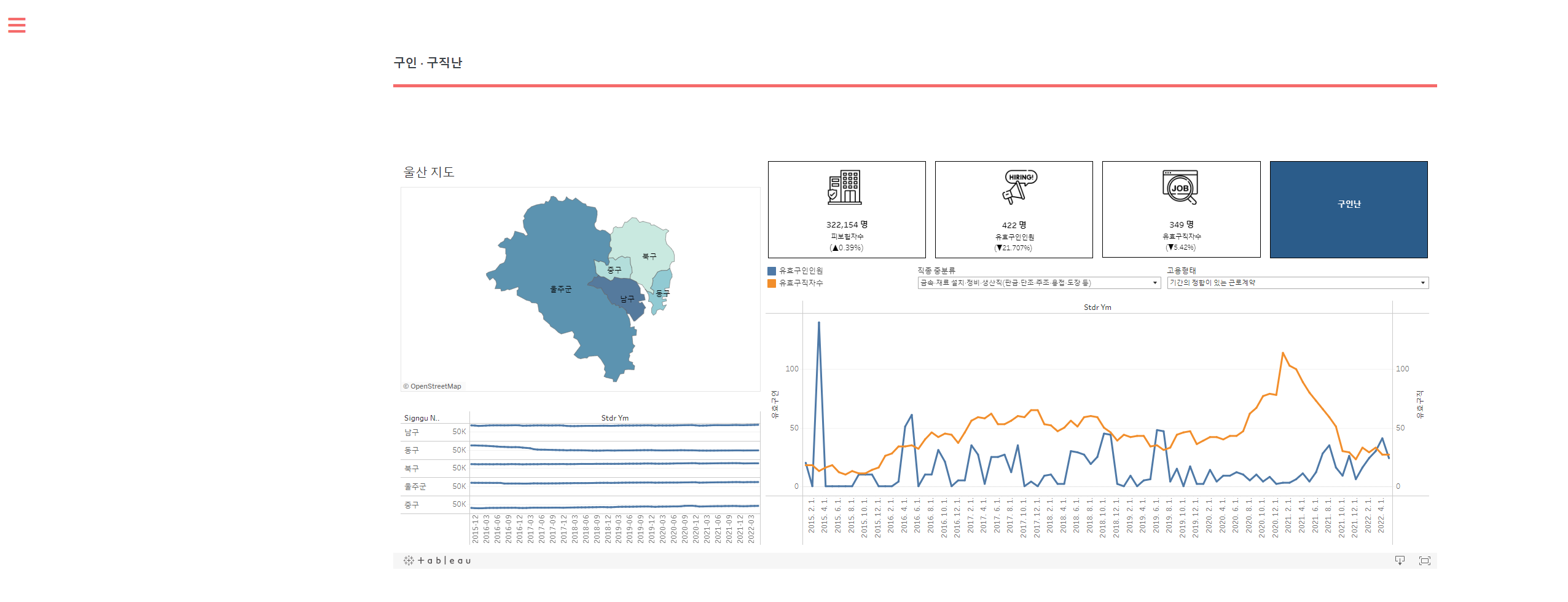 Bigreader 일자리 미스매칭 프로젝트 URL: https://aims.dingguri.com/ 개발목표 여러 통계자료와 KODATA에서 제공한 데이터를 사용하여 딥러닝 기술을 접목시켜 고용위기 지역을 예측하고 빅데이터를 기반으로 일자리 미스매칭 현황을 시각화하여 일자리 정책 관계자들이 선제적으로 대응할 수 있도록 돕고자 함. 개발기간 2022년 7월 18일 ~ 2022년 8월 31일 개발툴 메인화면 주요 메인기능 설명 메뉴바 지역별 고용위기 예측 지역별 산업구조 현황 지역별 인구구조 추이 구인 구직난 지역별 기업현황 인구별 변화 추이