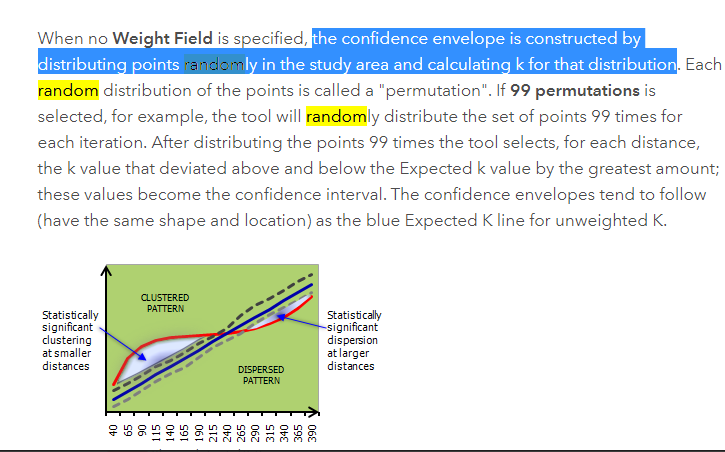 Secondly, I've noticed that in your implementation of the K function, you regard currentDistance as the exceptedL. However, according to the ArcGIS Document,the exceptedL is calculated by random distribution of the points. (the picture below)
