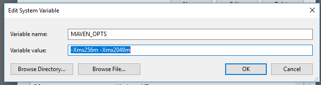 - Add MAVEN_OPTS environment variable, screenshot below.