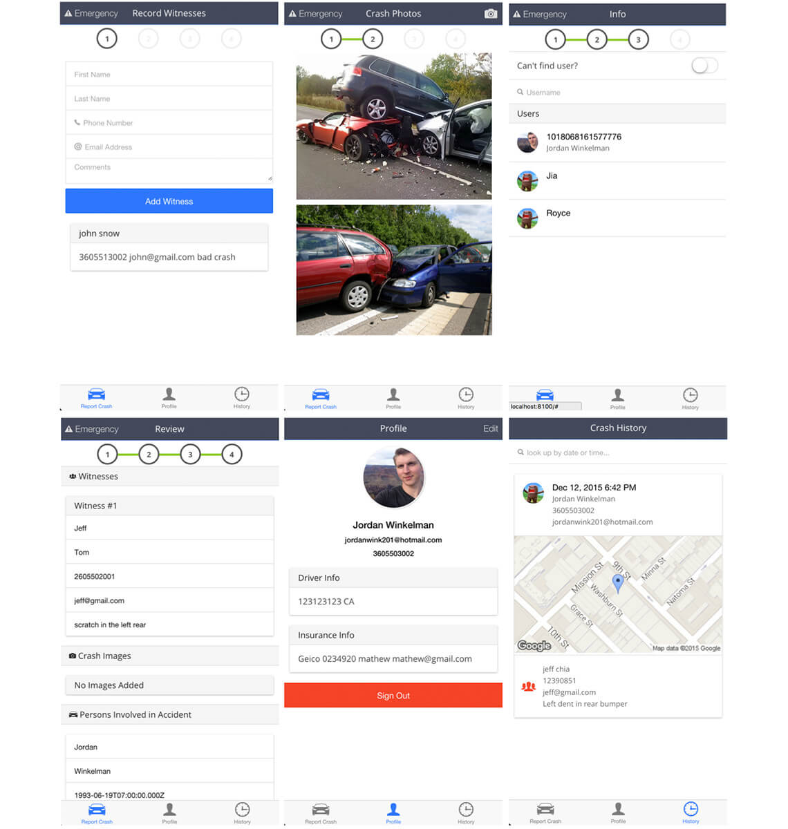 Vehicle accidents are a stressful situation and you often lose sight of what to do. CrashNinja is an application for guiding the user through a step by step process on how to deal with the situation. CrashNinja saves all the information related to the accident and automatically sends it to your insurance company. CrashNinja is a web and mobile application built in Ionic/Cordova.