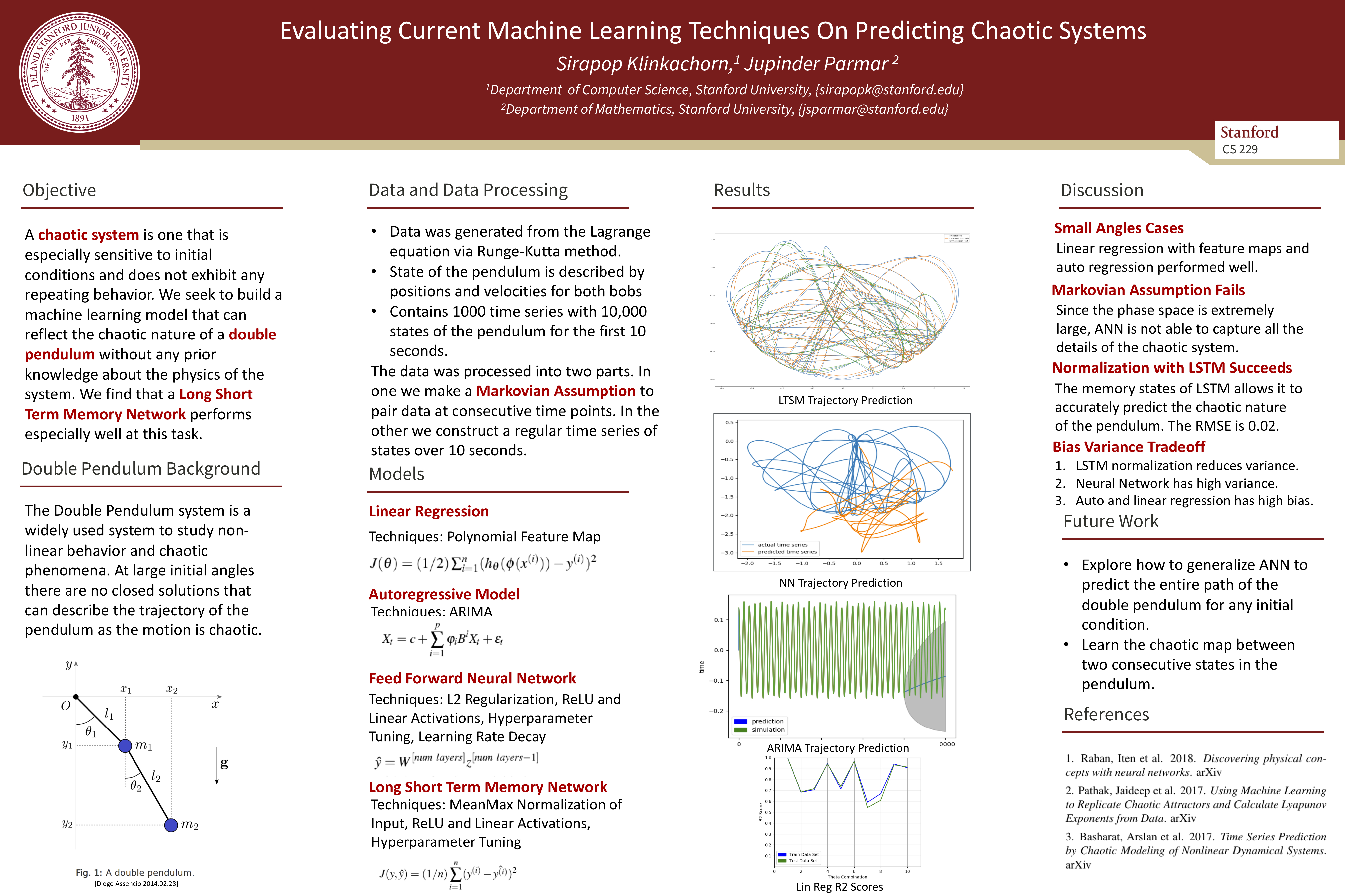 This repository contains code for machine learnign models that were built to predict the chaotic nature of a double pendulum. The linear regression and autogregressive models were applied towards double pendulums with smaller initial angles while the feed forward neural network and LSTM were mainly applied toward initial conditions with large angles.