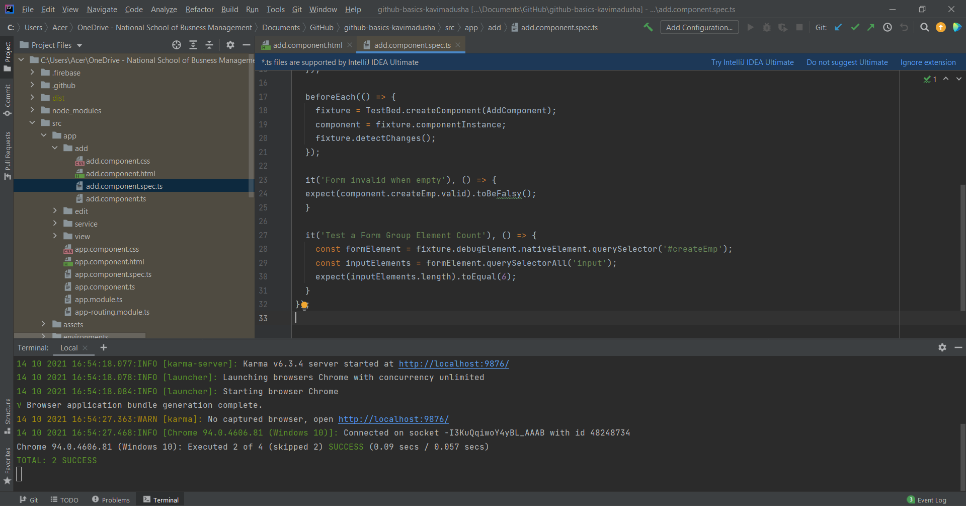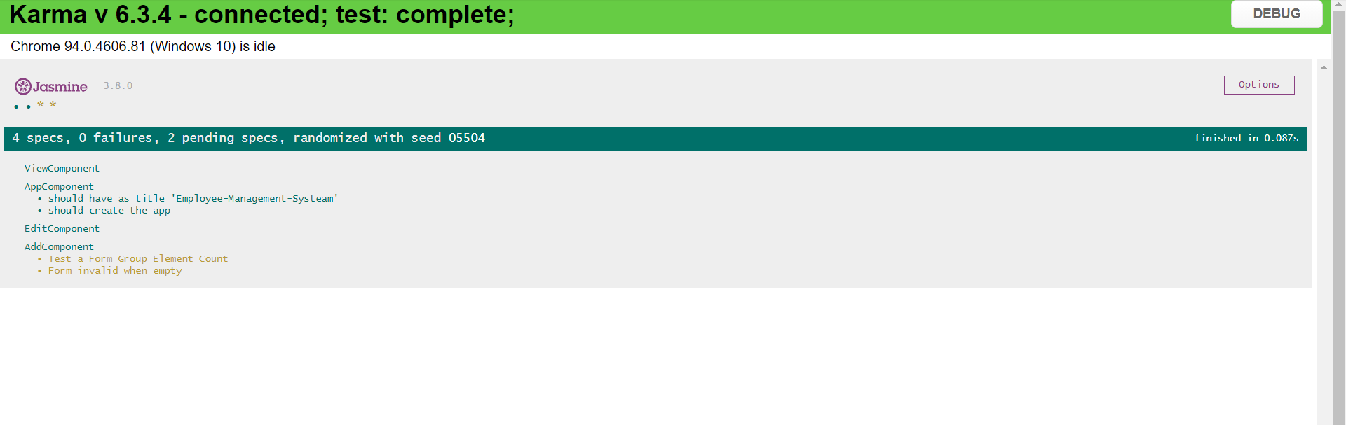 - I used Jasmine as a Unit testing framework and Karma as a Test runer.