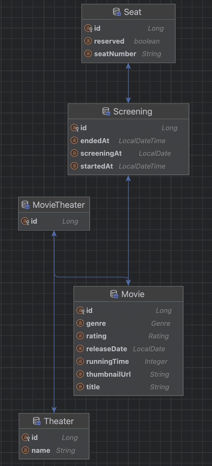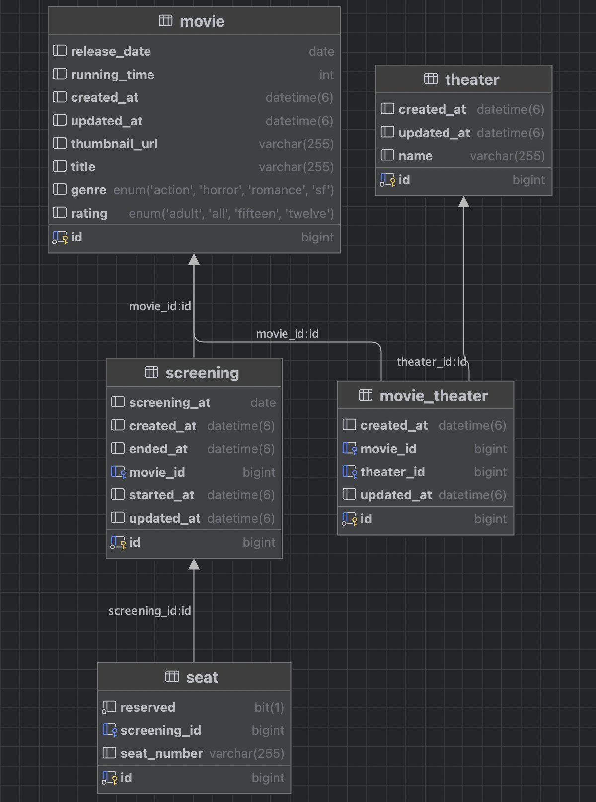Movie(영화)와 Theater(극장)은 M:N 관계이므로 MovieTheater로 일대다 다대일 관계로 설계하였습니다. Movie(영화)와 Screening(상영)은 1:N 관계이므로 일대다 관계로 설계하였습니다. Screening(상영)과 Seat(좌석)은 1:N 관계이므로 일대다 관계로 설계하였습니다.