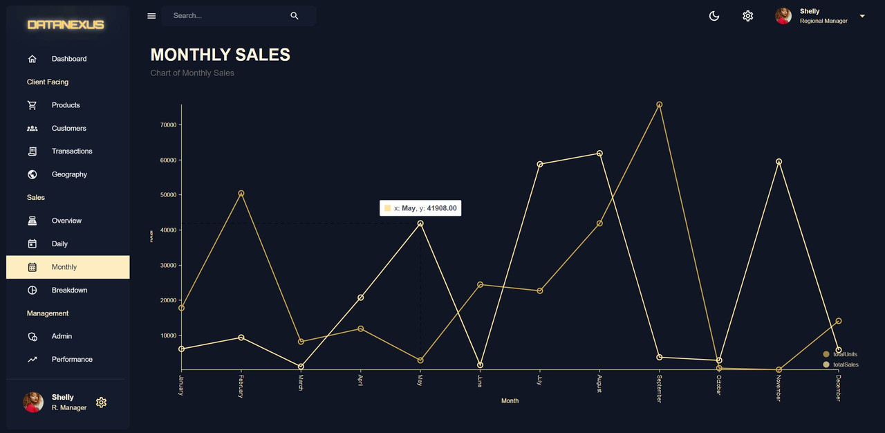 The Overview Page displays the overall revenue and profit of the year. It has two different views: units and sales. The data includes total customers, yearly sales total, yearly total sold units, year, monthly data, and sales by category. This data is saved in the MongoDB database and can be retrieved through an endpoint named