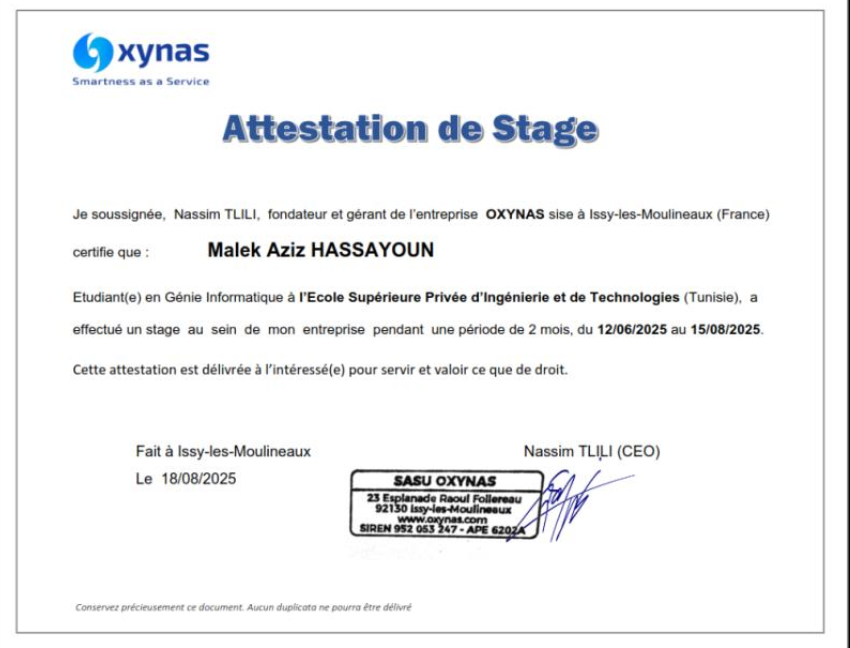 | OXYNAS | Intern in AI-powered web application pentesting | Jun 2025 – Aug 2025 | Paris / Remote | AI, Web Security, Python, Automation | Built an AI pentesting agent to reduce manual testing time | Certificate |