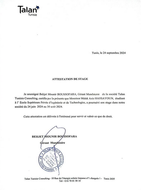 | TALAN-TUNISIA | Pentesting web application intern | Jun 2024 – Sep 2024 | Tunis, Tunisia | OWASP ZAP, Python, Web Security, Automation | Automated OWASP ZAP workflows with scripts | Certificate |