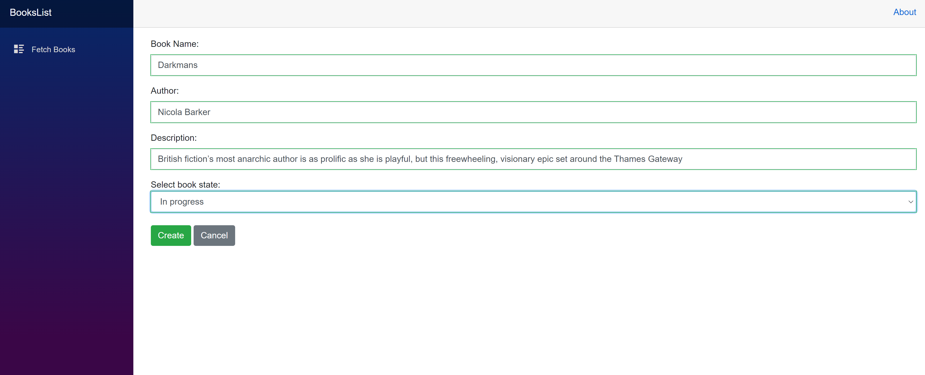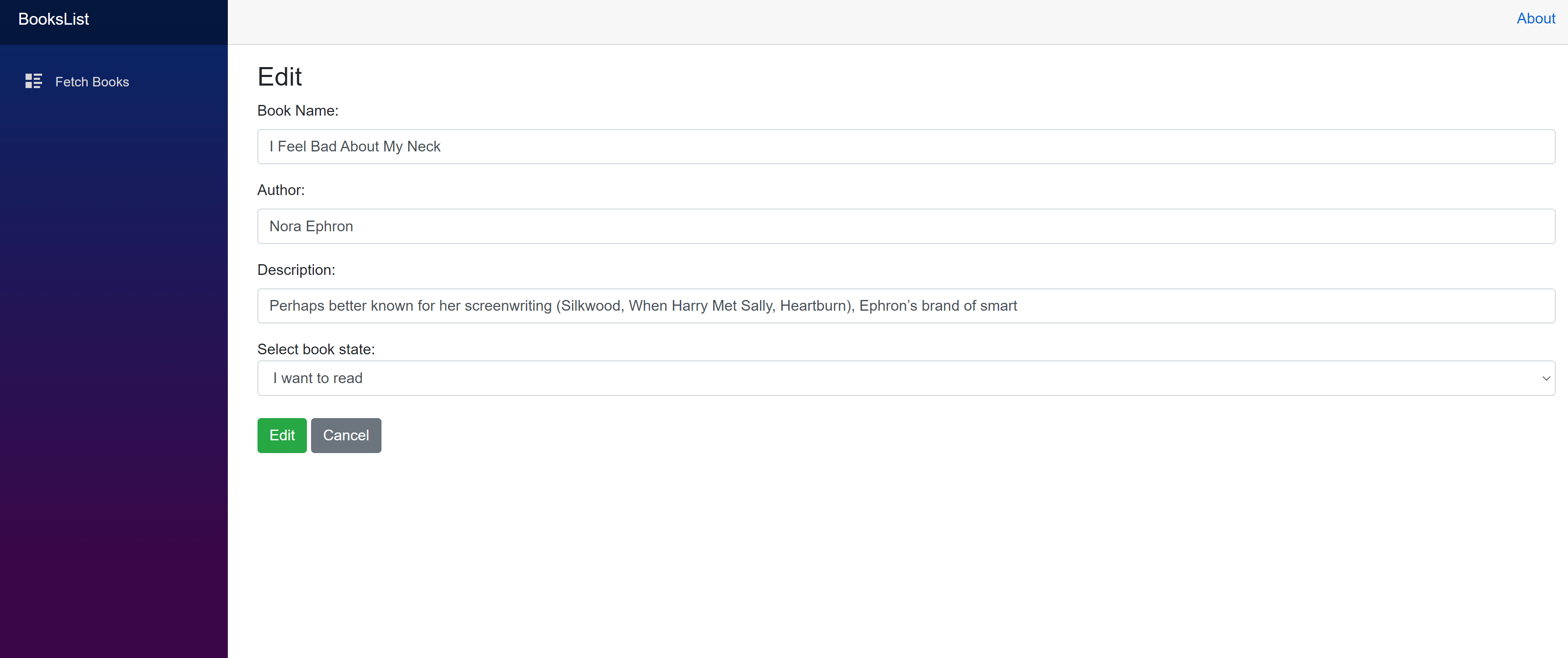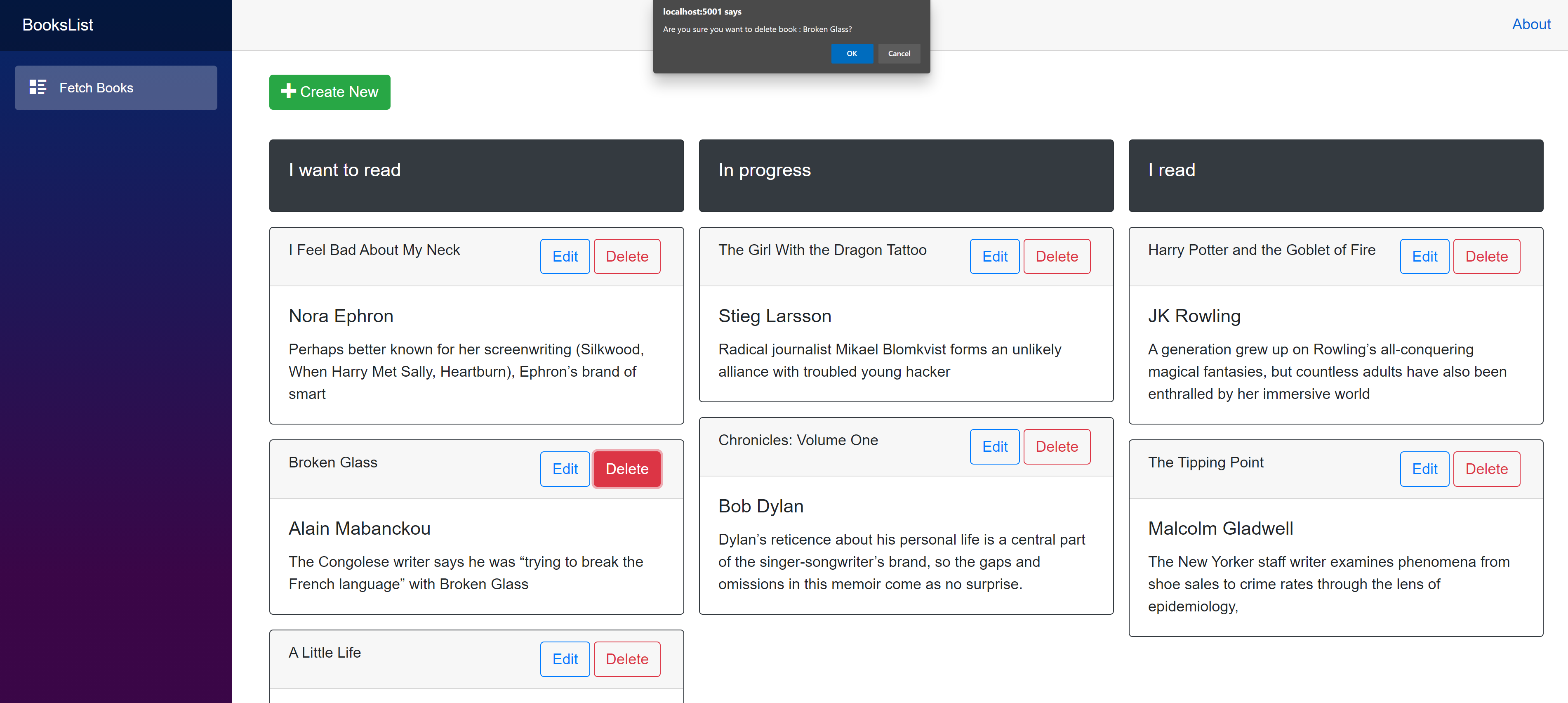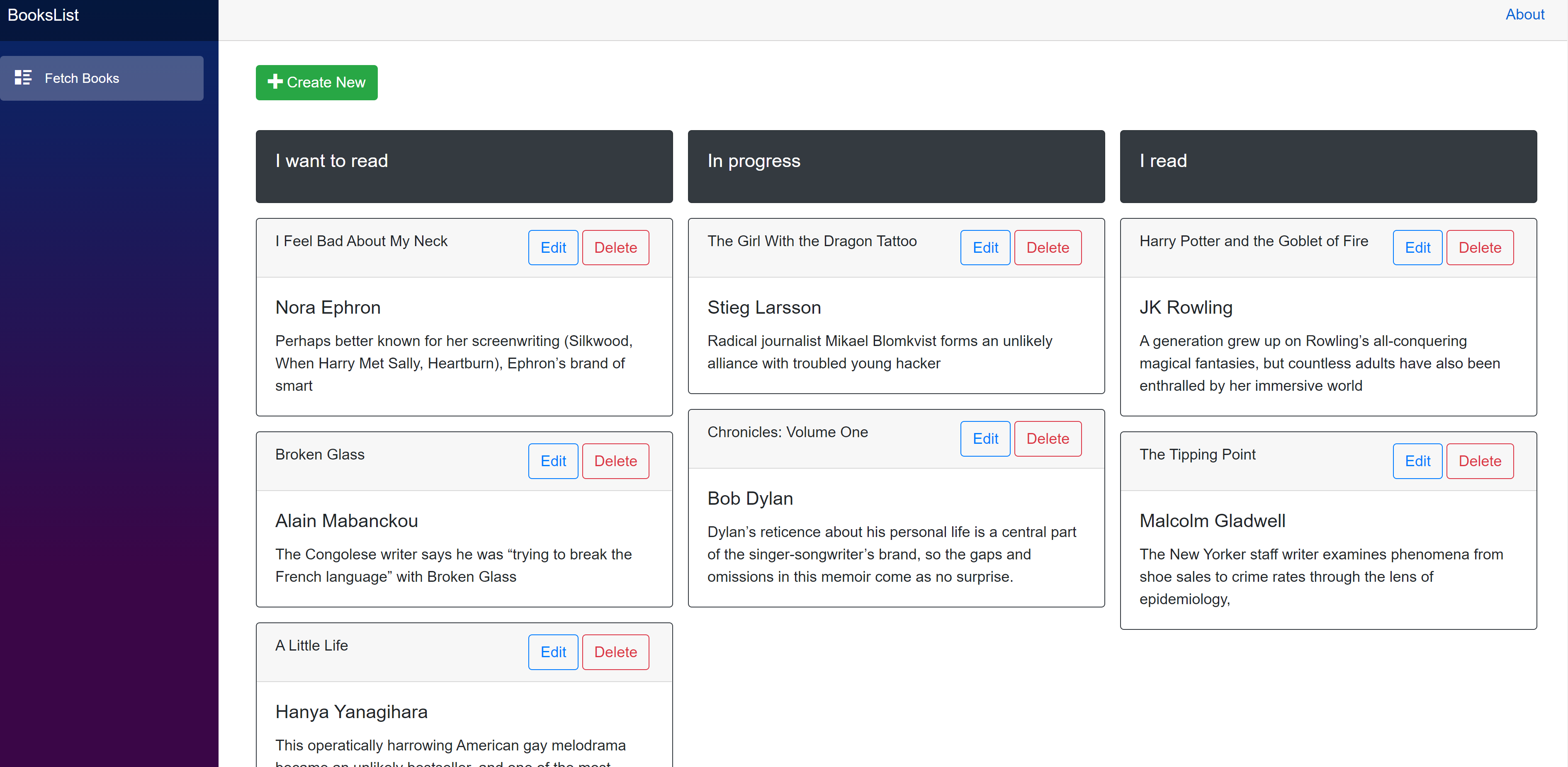 BooksList A small app for testing blazor (front-end) c# technology You have three states : I want to read In progress I read Create Action Edit Action Delete Action