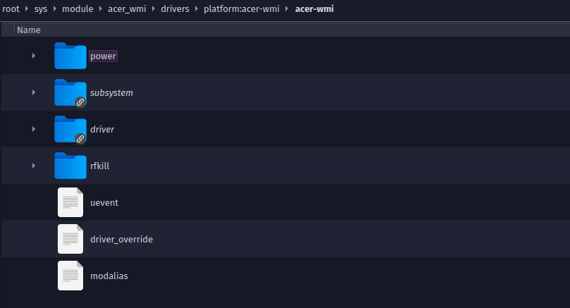 cd /sys/module/acer_battery_wmi/drivers/platform:acer_battery_wmi/acer_battery_wmi/acer_battery/
