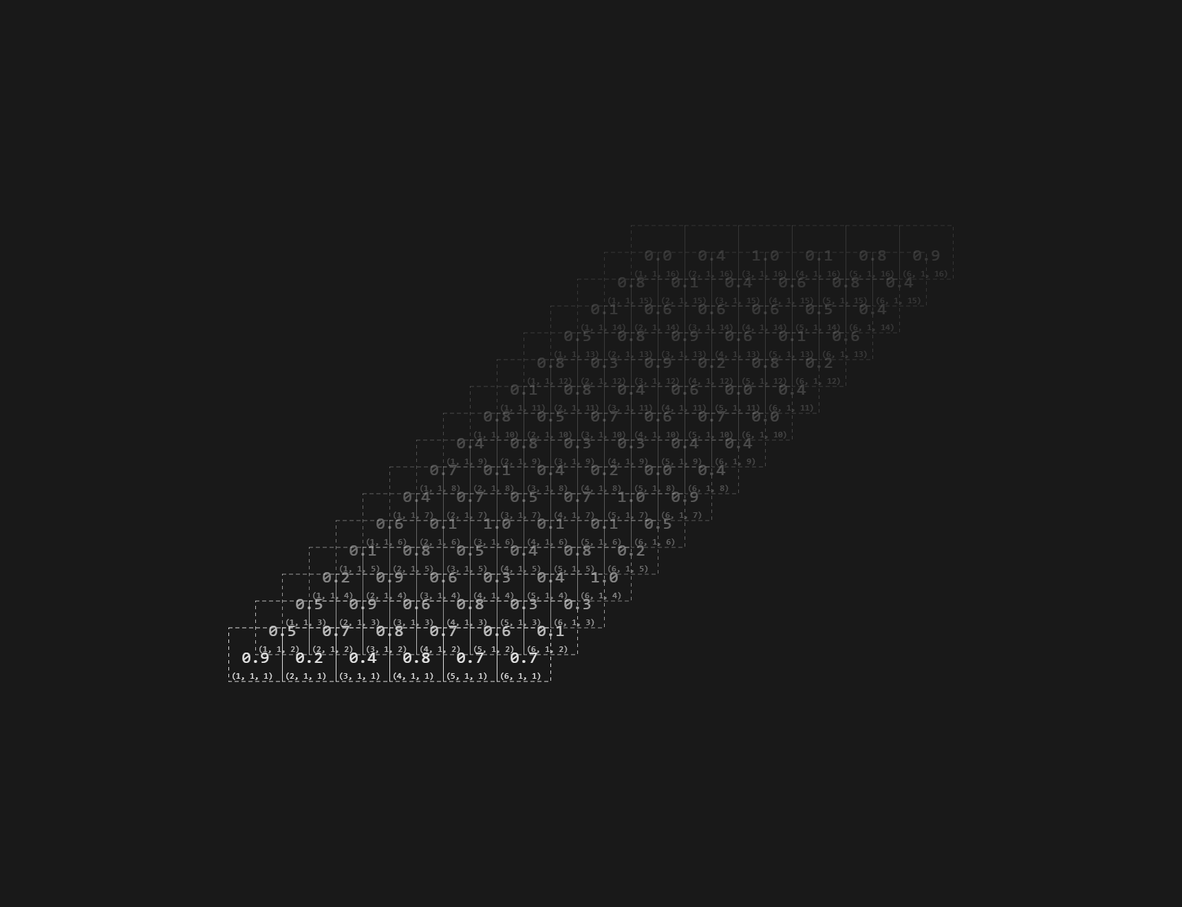 - scalar - uses 0-based scalars as indices, the scalar_hex variant encodes them as base16, for that additional hacker-flair! The alphaFalloffConstant controls how much then alpha of layers after the first falls of, setting it to zero disables the falloff completely. Since the data is drawn responsively, and the canvas automatically fills it's parent container, the fillPercentage prop can be used to inset the tensor inside the visualizer, changing how much space it can use up. (You could also use this for an improvised zoom-functionality, but I haven't tested what happens if you increase this beyond 100...) With showBoundingBox you can display a nice bounding-box around the data, this will most likely be useful for debugging.