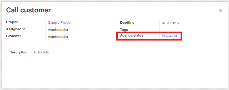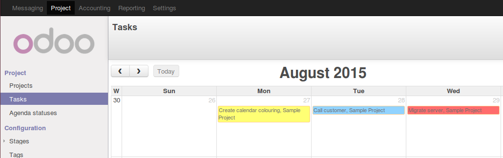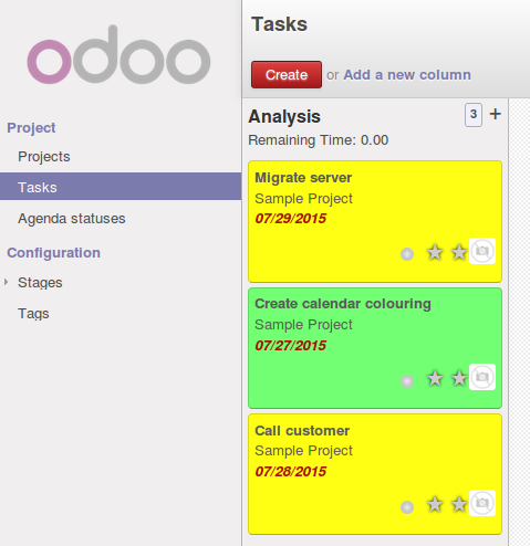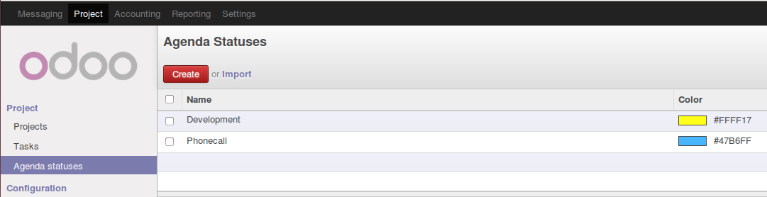Note: If you want to use this module you will also need to install the module web_widget_color. This module builds on top of that module. This module will give you the ability to add custom colours to tasks which will then re-color the agenda view. There is a new view created 'Agenda statuses' where you can create a status with a color from the color picker. On the project task you can then choose an agenda status. When you'd go to the kanban view you will see it being re-coloured. This module does almost the same as ```project_task_agenda_colouring``` but this module colours the Kanban view, not the agenda view. Agenda statusses view: