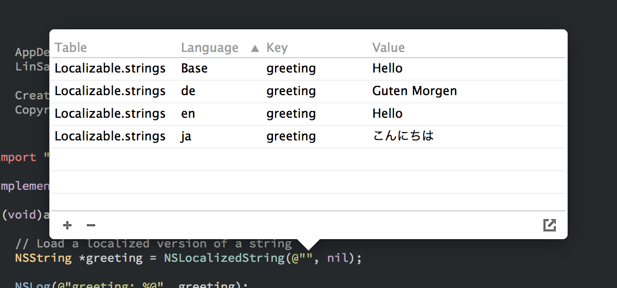 When you are focusing on NSLocalizedString or other functions to get a localized version of a string, Lin shows the list of localizations that contains the inputted key string.