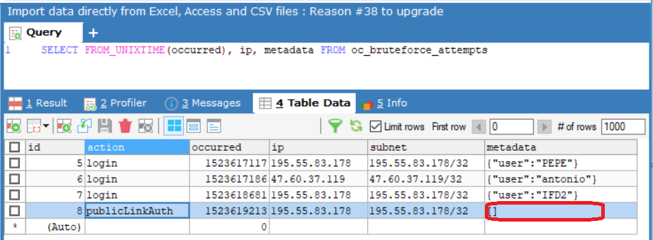 But appart from that, we would like to see in the metadata field of the table oc_bruteforce_attempts not only information about the user used in the wrong validation, but also the the public link token in case it is protected by a password (this app protects wrong validations of users and public links).