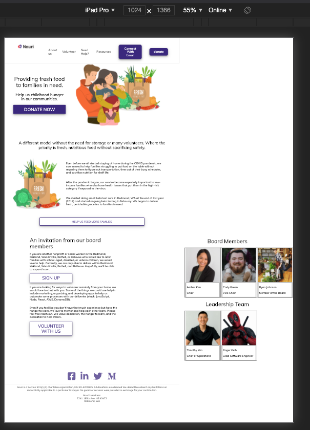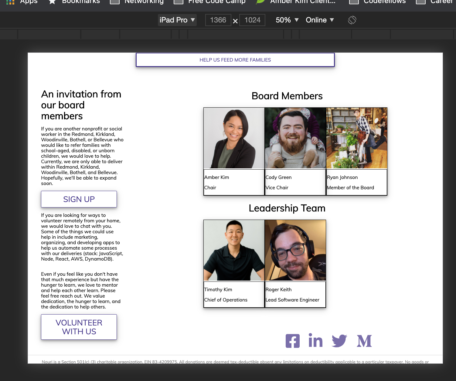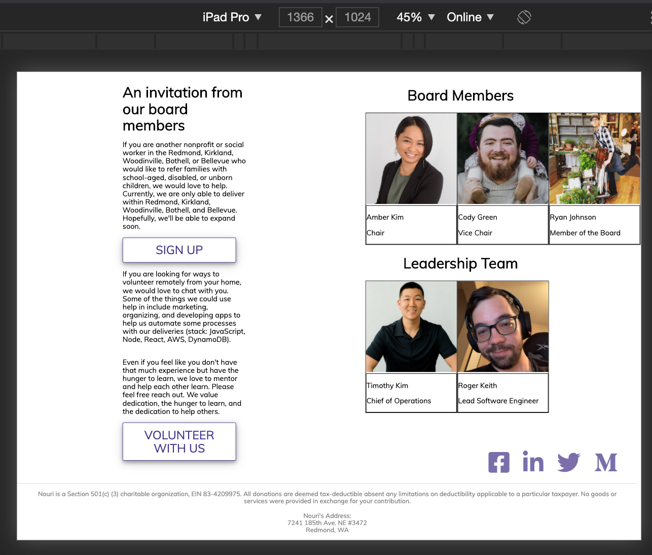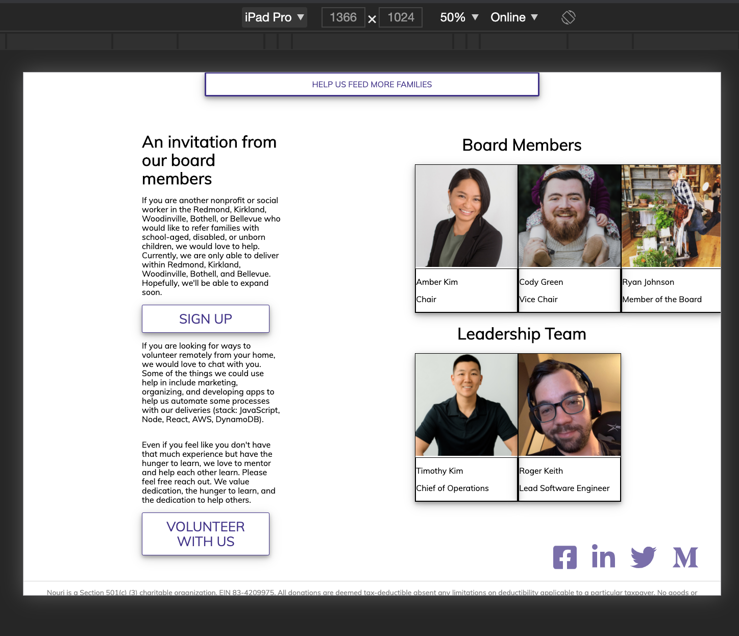 @rhtaylor Much improved on mobile. 👏 Some more feedback and refinement: Let's have the pictures show up on earlier on 1024 width.The funkiness at the bottom for larger screens is still overflowing to the right. You can see the border of the top bar ending earlier than the screen. This is probably a matter of the widths of paddings, margins, element widths, and borders, not adding up to more than 100% of the total width. We can also work to center the icons on bigger screens. |
