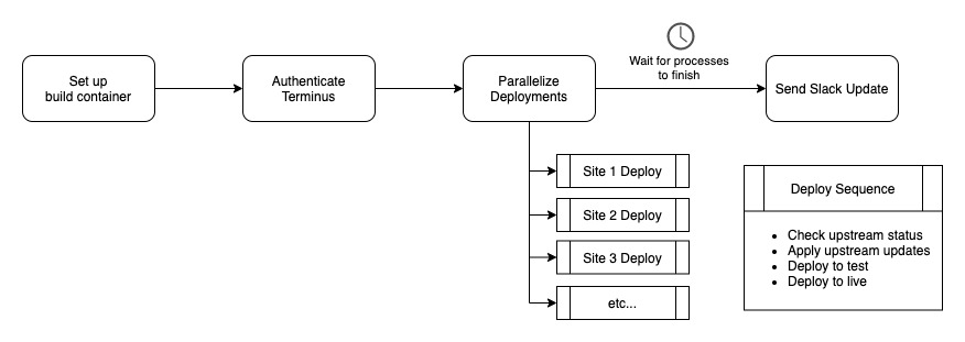 Terminus is a process-driven, Symfony console application that implements cURL requests using PHP in the background to the Terminus API. When considering multiple deployments, there are considerations in the current implementation: