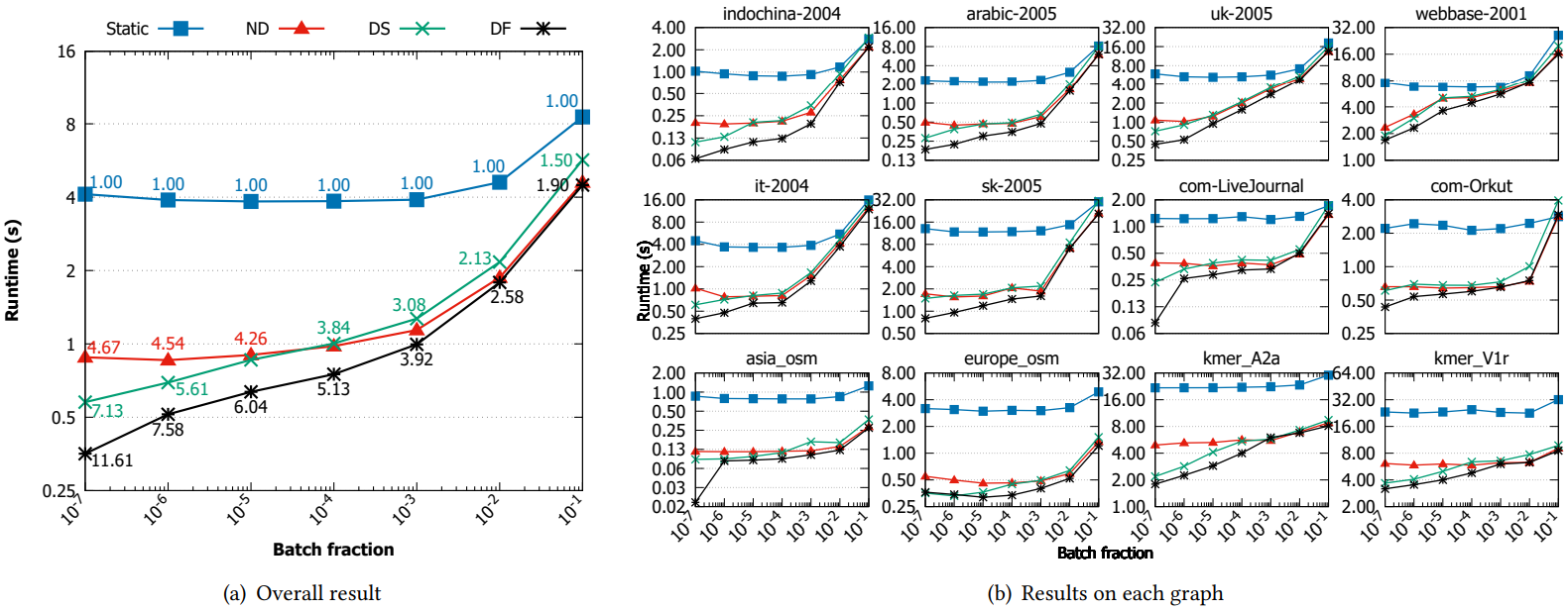 Below we plot the time taken by our improved Naive-dynamic (ND), Delta-screening (DS), and Dynamic Frontier (DF) Leiden, against Static Leiden on 12 large graphs with random batch updates of size 10^-7|E| to 0.1|E|, consisting of 80% edge insertions and 20% deletions. We observe that ND, DS, and DF Leiden achieve mean speedups of 3.9×, 4.4×, and 6.1×, respectively, when compared to Static Leiden. This speedup is higher on smaller batch updates, with ND, DS, and DF Leiden being on average 4.7×, 7.1×, and 11.6×, respectively, when compared to Static Leiden, on batch updates of size 10^−7|E|.