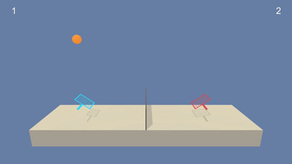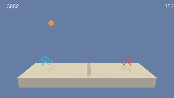 In this environment, two agents control rackets to bounce a ball over a net. If an agent hits the ball over the net, it receives a reward of +0.1. If an agent lets a ball hit the ground or hits the ball out of bounds, it receives a reward of -0.01. Thus, the goal of each agent is to keep the ball in play.