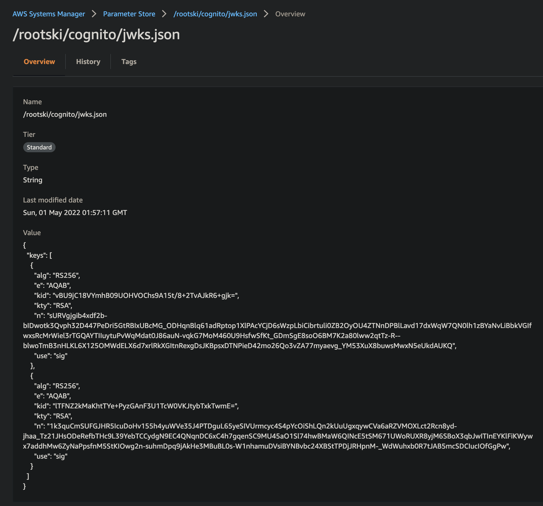 Thanks to this, the rootski API code running in AWS Lambda can fetch the JWKs from SSM.