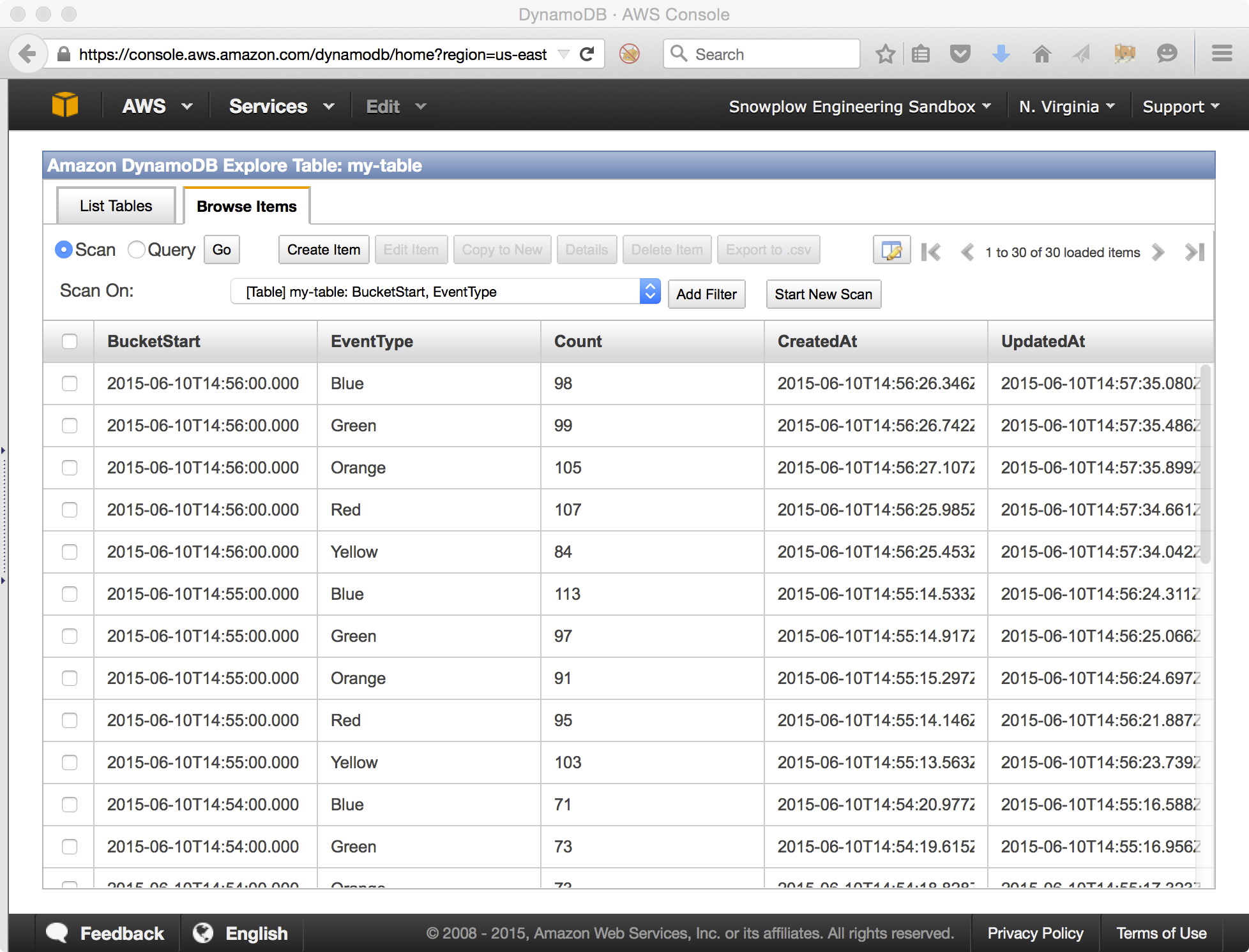 }Our job counts the events by type and aggregates these counts into 1 minute buckets. The job then takes these aggregates and saves them into a table in DynamoDB: