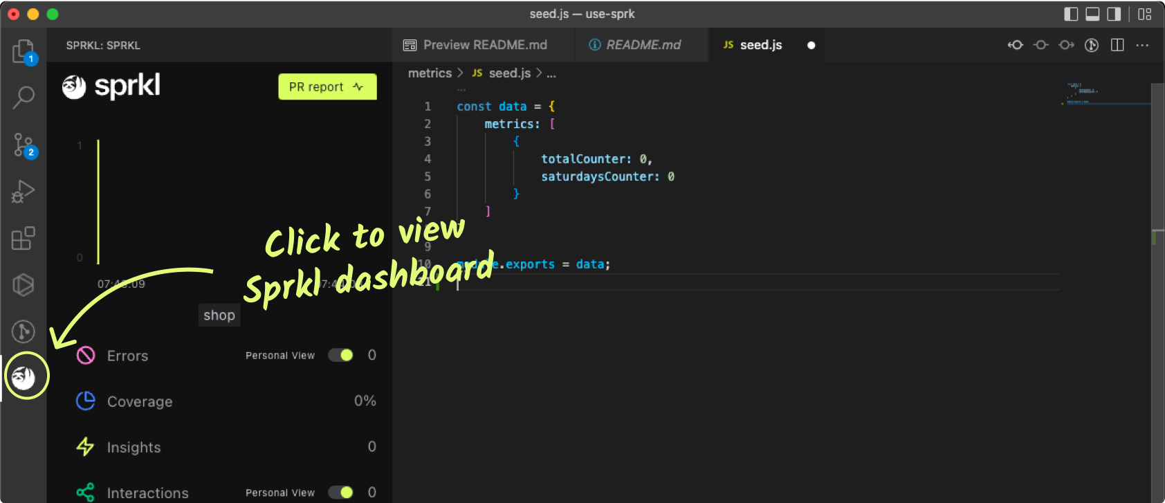 Open the sprkl extension dashboard (click on the sloth icon on the left panel) to see the results in the Sprkl dashboard.