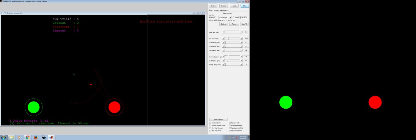 This should then get you the default touch training mode, where on the right you have what the monkey sees, on the left what the experimentor sees. The goal is to touch the white circle to get a reward. Move the mouse all the way to one side (right) until it comes out the other screen on the left and it now should leave a trail on the Kofiko machine (the left screen is run by the kofiko machine and is what the experimentor sees, the right screen is what is on the touch screen and what the monkey sees, also called the stimulus server). This trail is supposed to be the eye tracking of the monkey eye, but as we use it in touchscreen mode it is where the touchscreen is touched. If you use the mouse, whenever the mouse xy coordinates change, that is considered a touch. As would be the case if you drag your finger over the screen without ever lifting it. So if the mouse is not within the circle and is moved, the first pixel it moves to is considered the input, so very unlikely will you make it into the circle. When done, close the window (press the small x top right on the Kofiko machine (the left screen, the one with the buttons)).