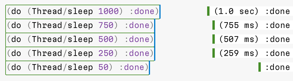 By default, Clojure Sublimed will also print evaluation time if it takes more than 100 ms: