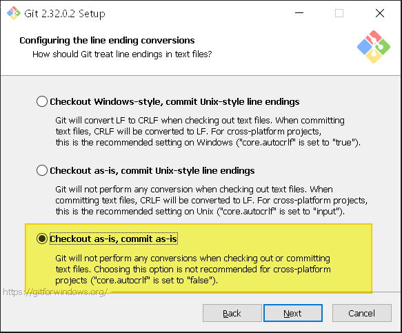 설치 진행 중 다음 단계에서 "Checkout as-is, commit as-is" 선택