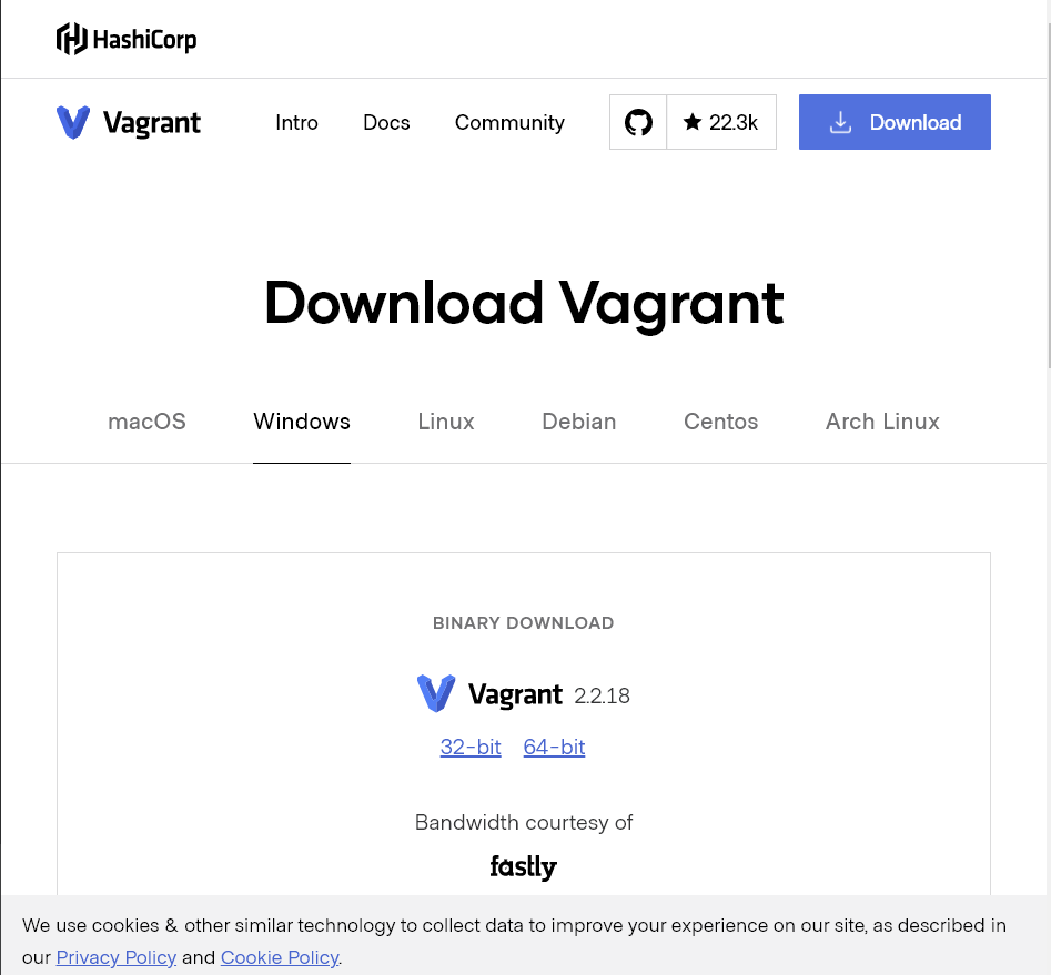 64-bit 를 선택하여 설치파일을 다운로드 하고 "vagrant_2.2.18_x86_64.msi" 을 실행하여 설치