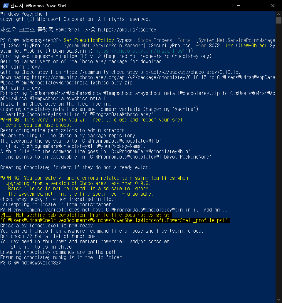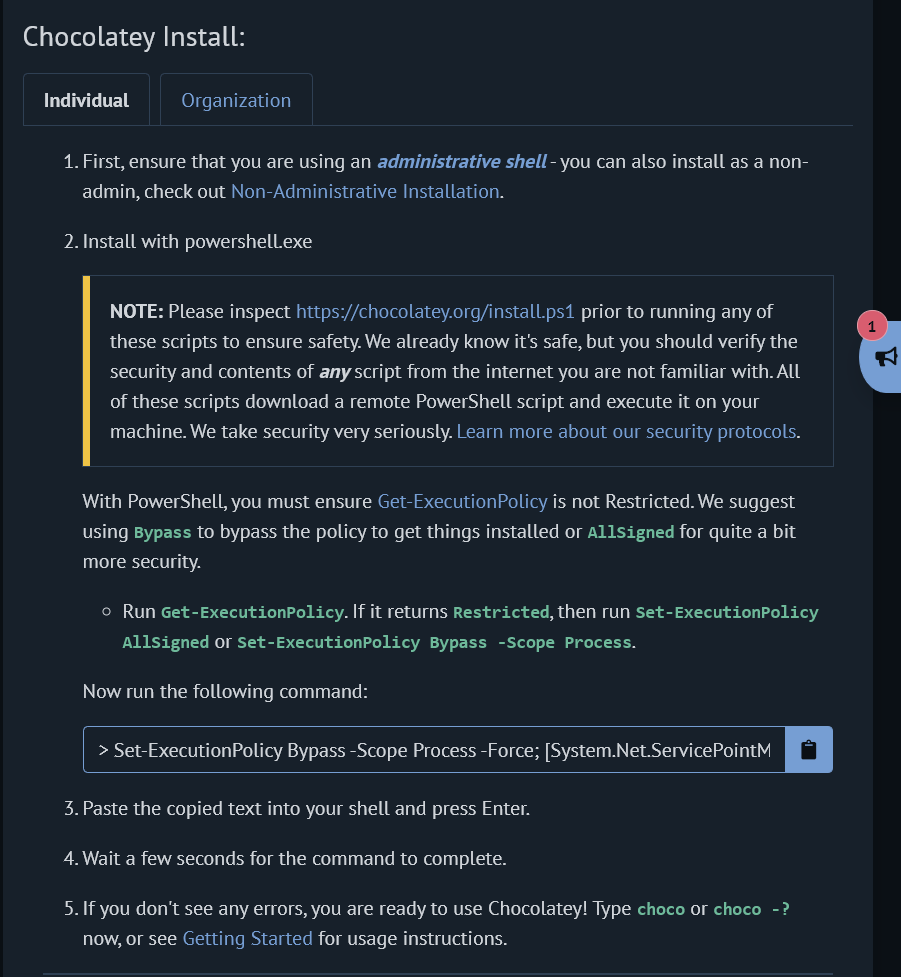 Set-ExecutionPolicy Bypass -Scope Process -Force; [System.Net.ServicePointManager]::SecurityProtocol = [System.Net.ServicePointManager]::SecurityProtocol -bor 3072; iex ((New-Object System.Net.WebClient).DownloadString('https://chocolatey.org/install.ps1'))