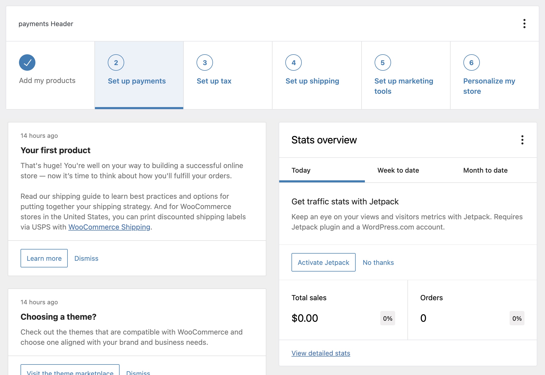 . - Go to WooCommerce > Home or refresh this page, a new task list should be displayed (example pic)