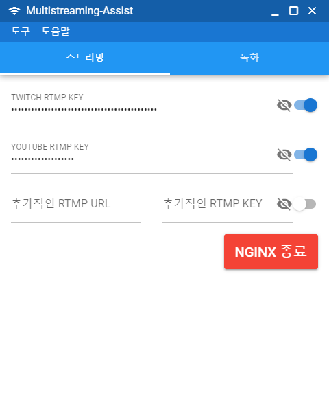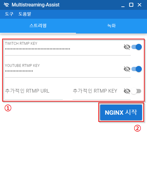 - 상단 입력칸에 본인이 송출을 원하는 RTMP Key 값을 입력하고, 우측 토글 스위치를 활성화해서 킵니다