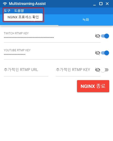 (2) Windows Defender 외의 서드파티 백신을 사용 할 경우A. '도구' > 'NGINX 프로세스 확인' 탭을 클릭하면 됩니다