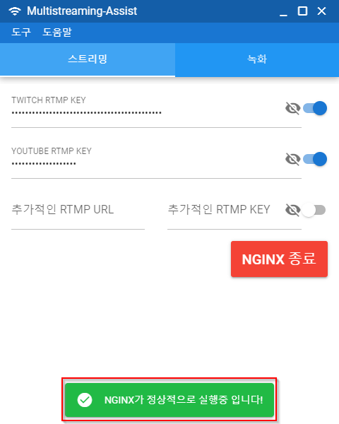 - 이때, 방송 시작이 정상적으로 진행되지 않는다면 nginx.exe가 제대로 실행되지 않았을 가능성이 높습니다, 이에 대한 자세한 정보를 알고 싶으시다면 Q&A 항목을 확인해 주세요