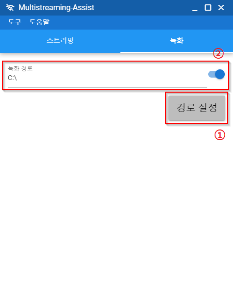 - '경로 설정' 버튼을 클릭하고, 녹화 파일을 저장할 경로를 설정해 줍니다, 직접 입력해도 상관 없으나 경로 설정을 이용한 설정을 권장합니다