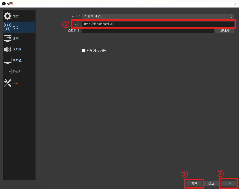 - 서버 칸에 'rtmp://localhost/live' 라고 적은 후