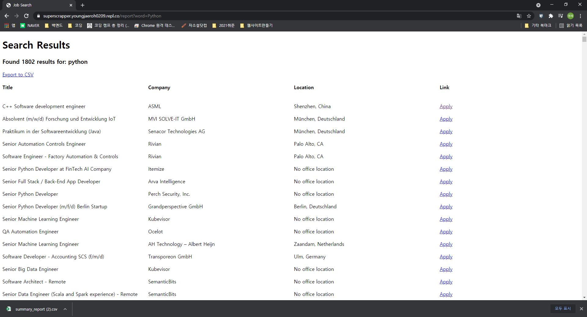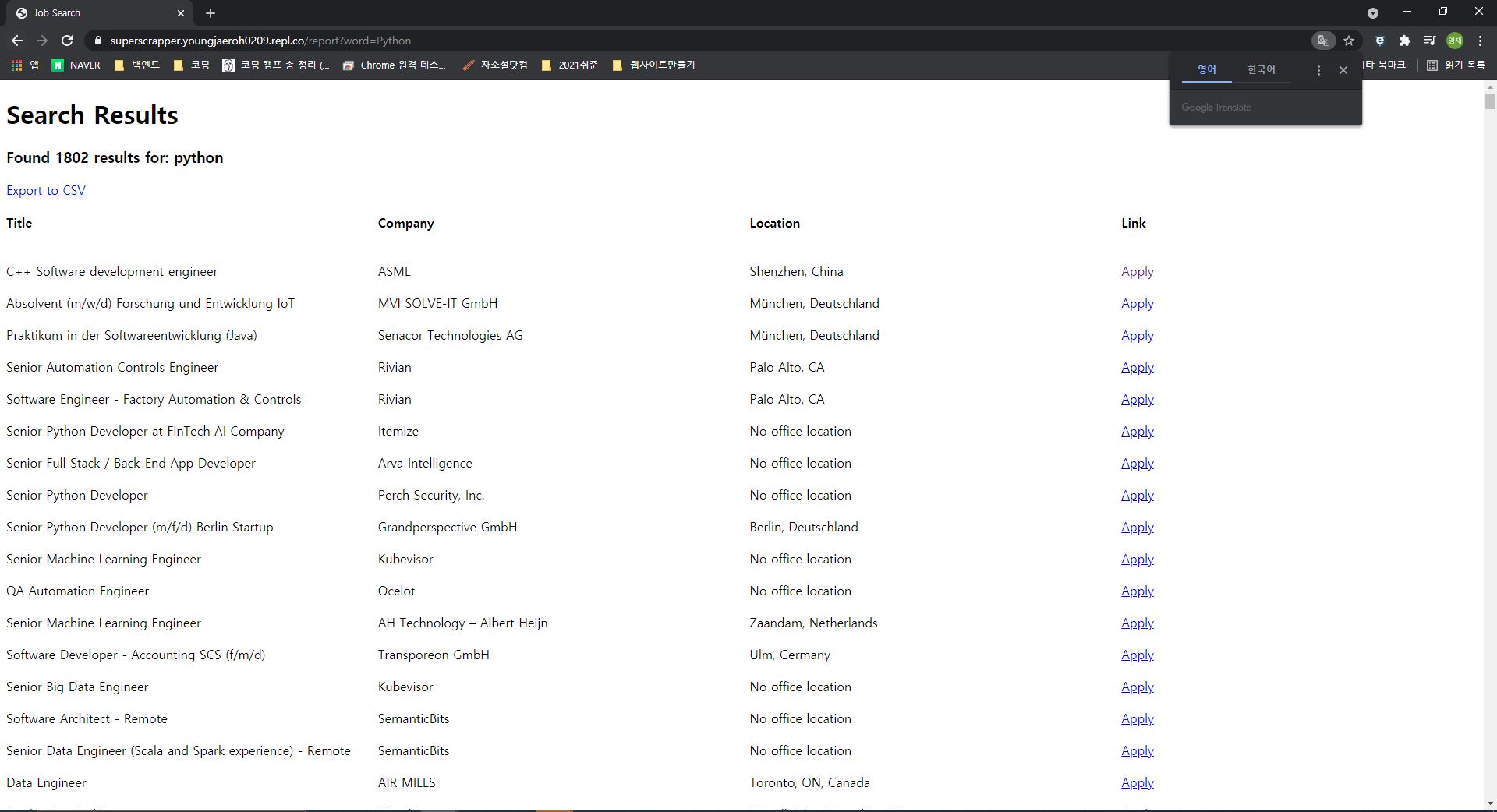 - 마지막페이지를 찾고, 마지막페이지까지 해당직종의 목록을 title,company,location,apply_link로 각각 저장